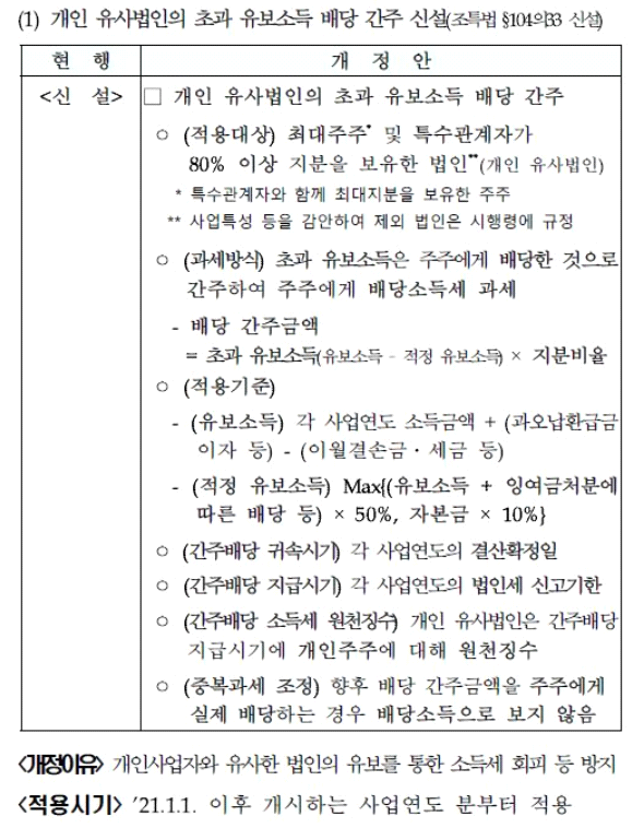 <개인 유사법인의 초과 유보소득 배당간주 세법개정안 내용 요약>