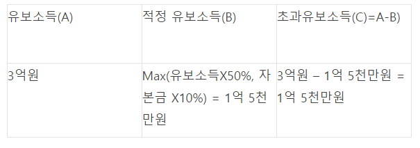 신설 규정 내용을 요약하자면 최대주주 및 특수관계자가 80% 이상의 지분을 보유한 법인은 개인 유사법인으로 분류되고 이 경우 유보소득의 최대 50% 또는 자본금의 10% 중 높은 금액은 적정 유보소득으로 간주됩니다. 해당 적정 유보소득을 초과하는 금액은 배당으로 간주하여 주주에게 배당소득세를 과세하게 됩니다.
